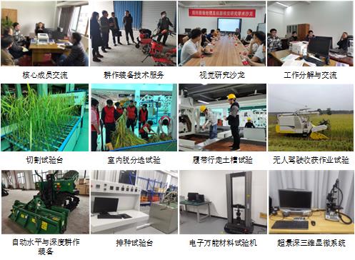 现有研发人员24人,其中教授13人,副教授或高级工程师8人,讲师3人。2012年技术团队被评为金华市首届优秀科技创新团队。团队成员中现有全国技能能手1人,浙江省151人才1人,全国教学名师1人,浙江省教学名师4人,浙江省重点学科负责人1人,浙江省首席技师1人,金华市技能大师1人,金华市新世纪321人才6人。中心通过未来三年的建设,目标是要建立一个管理规范、运行高效、产出丰富的现代农机装备高新技术研究开发中心。现有实验试验条件,包括超景深三维显微系统、高速度数码相机、计算机视觉排种器性能检测试验台、电子万能材料试验设备等仪器设备,为现代农机装备高新技术研究开发中心研究提供支撑。主要进行耕作装备技术、种植装备技术与收获装备技术三个方向研究。(1)耕作装备技术主要开展保墒耕整技术及关键部件研究、脱附减阻技术及关键部件研究、降低耕整作业油耗研究和耕整作业对环境影响的研究;(2)种植装备技术重点攻克水稻精准插秧技术与装备等技术和机具,使杂交稻、超级稻精密种植装备技术达到国内先进水平,玉米高效精量播种装备技术达到国内领先水平;(3)收获装备技术重点开展智能化谷物联合收割机关键技术、制造工程技术和产业化攻关,开展室内和田间载荷、性能、可靠性等试验研究。