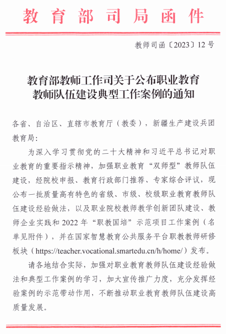 据悉,本次评选共公布12个2022年“职教国培”示范项目工作案例,西安交通大学等8个本科院校入选,4个高职院校入选,金职院国培案例的成功入选体现了教育部对我校“国培”项目培训经验模式和职教师资精准专业培训的充分肯定。
