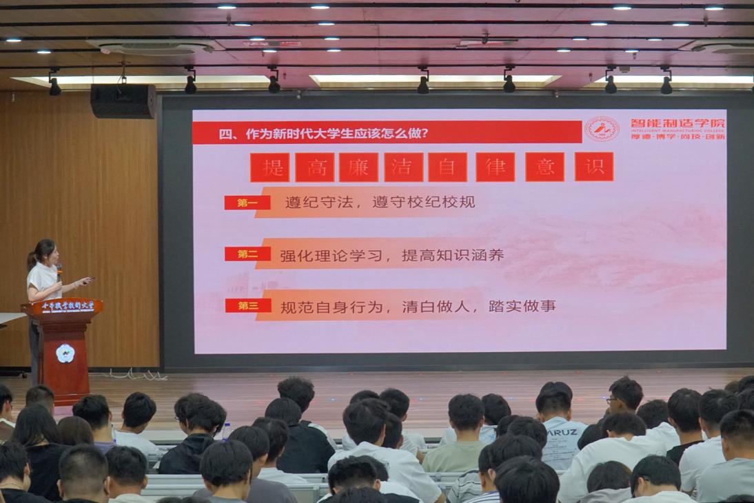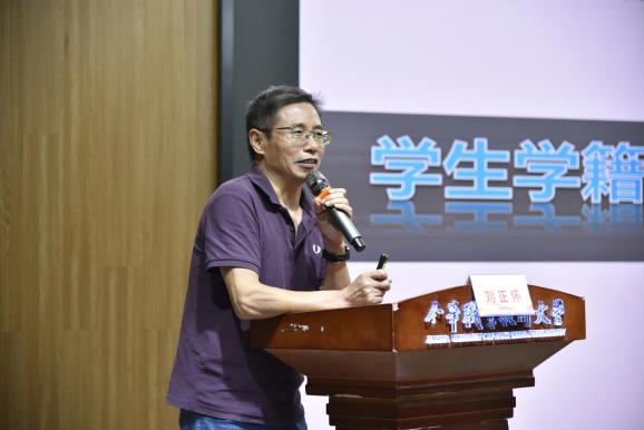 学校教务处副处长刘正怀、学院教学办负责人章卉莹老师分别给新生们介绍学籍管理相关事宜,涵盖学籍异动管理、通识课选修课办理、教材的领取和发放、各类考试通知、重修安排、学业预警告知和体育免修办理等内容。