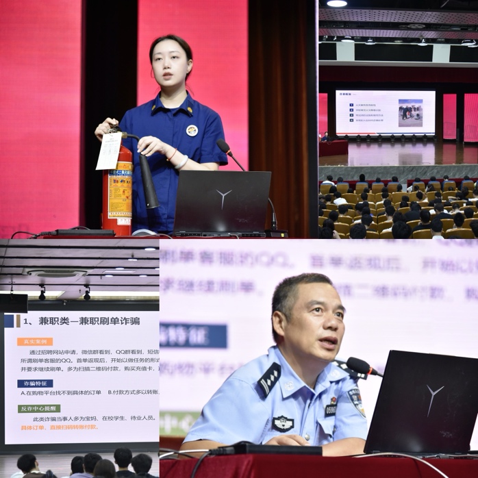 学院特邀金华经济开发区消防救援大队宣讲员祝天慈与西关派出所民警谢国发同台开讲,打造“消防+反诈”双线融合的安全课堂。宣讲员结合学院实训设备多、用电量大的特点,现场演示灭火器使用并强调操作规范;民警则针对男生居多的实际情况,聚焦游戏交易、刷单诈骗等高发骗局,通过真实案例剖析诈骗套路,帮助学生筑牢思想防线。