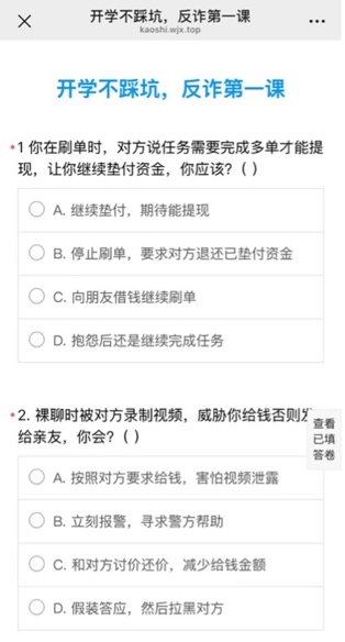 活动创新推出“反诈预热”机制,通过精心设计的问卷覆盖刷单返利、游戏交易、裸聊敲诈等五大高频诈骗场景,在新生群体中开展精准风险筛查。问卷不仅成为学生自我检测的“警示器”,更成为学院开展靶向宣传的“指南针”,为后续个性化安全教育提供扎实依据。