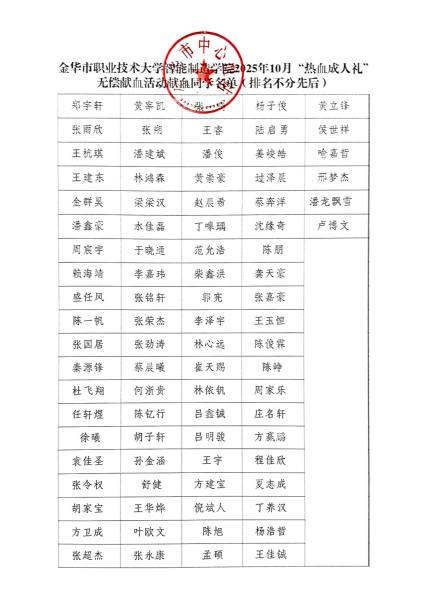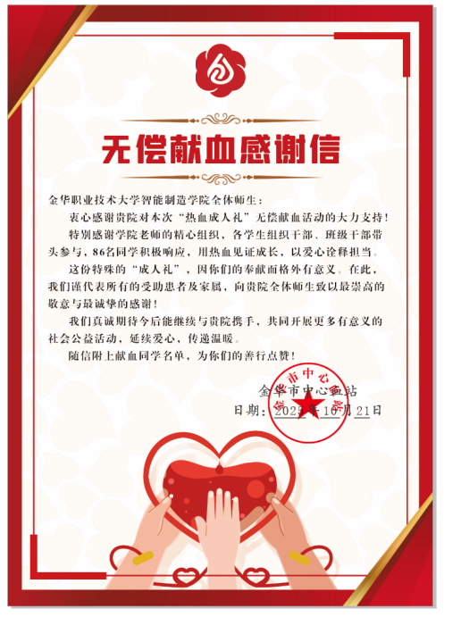 这份情真意切的致谢,专为10月16日我院协办的 “热血成人礼” 无偿献血公益活动而来,此次活动由金华市中心血站主办、智能制造学院协办,在我院一站式学生社区 —— 智造 “工” 寓顺利开展。