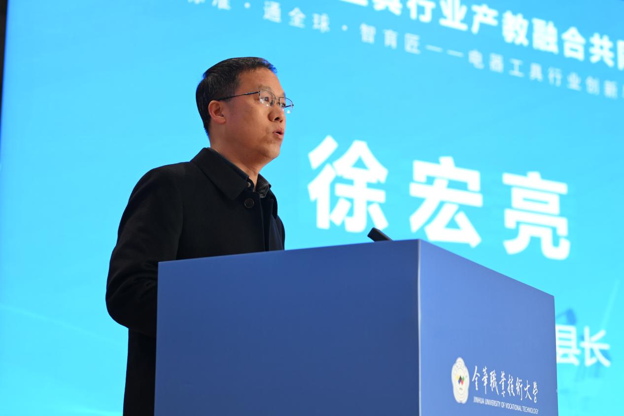 徐宏亮在讲话中提到武义作为创新智造的活力之城,坚持“工业强县”战略,拥有6个国家级制造(出口)基地,2025年电动全产业链产值预计超180亿元,全县规上工业总产值突破860亿元,科技创新指数位居前列,是全国科技创新百强县。同时,他表示武义县政府高度重视产教融合,未来希望以共同体为纽带,进一步优化发展环境、加大政策支持,积极推动本地企业与职业院校、科研院所深度合作,抢抓科技革命和产业变革机遇,通过共建实训基地、共组教学团队、共研技术项目等方式,实现人才培养与产业需求的同频共振,携手校、企共同推动智能电器工具行业高质量发展。