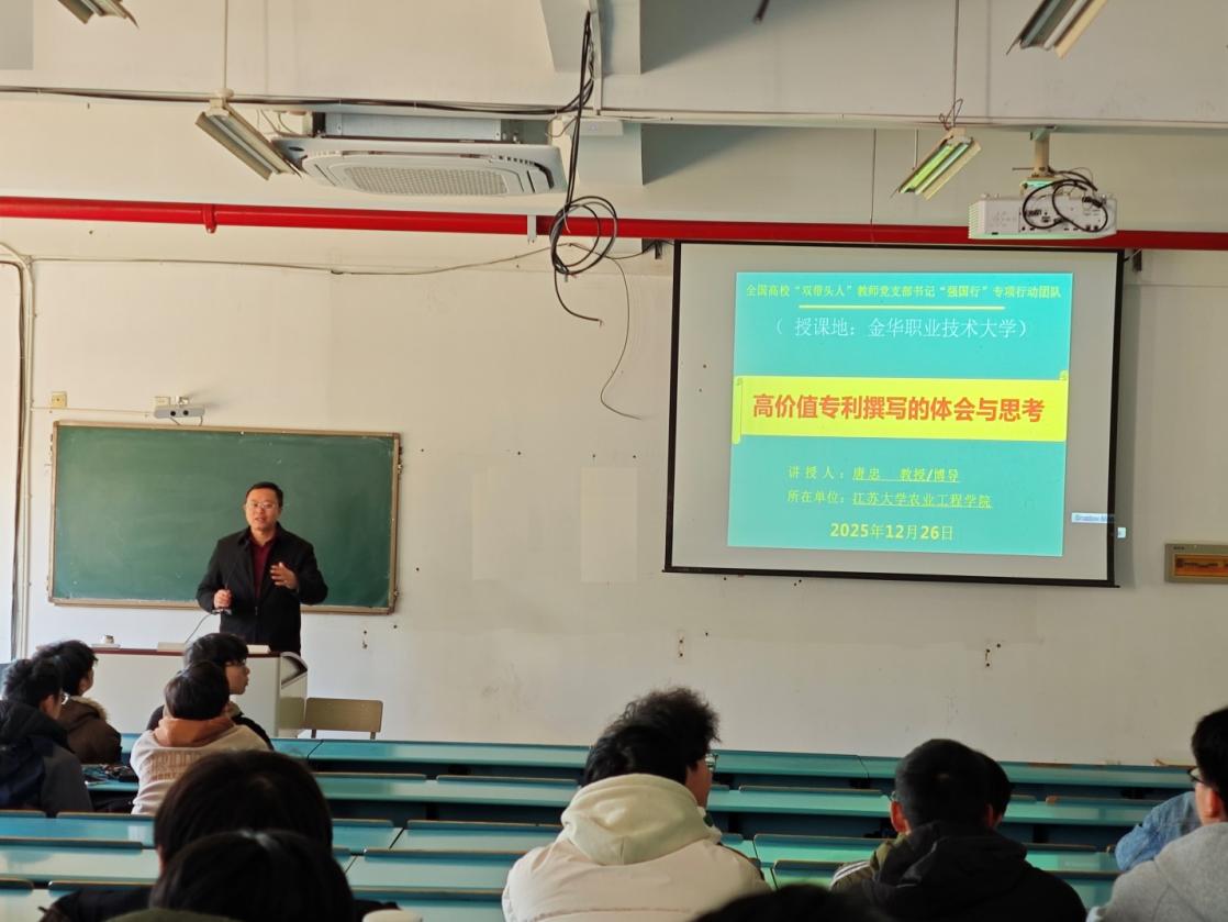 2025年12月26日,金华职业技术大学智能制造学院工业机器人技术专业举办“高价值专利撰写的体会与思考”专题讲座。本次活动旨在深化产教融合、推动应用型人才培养,加强学生对高价值专利撰写与转化的理解与实践能力。讲座特邀全国高校“双带头人”教师党支部书记“强国行”专项行动团队负责人、江苏大学农业工程学院唐忠教授担任主讲。工业机器人技术专业89名大一学生及浙江省农作物收获装备重点实验室6名科研助理参加培训。