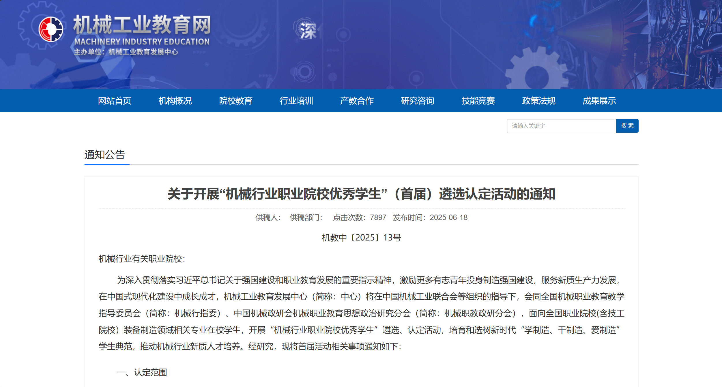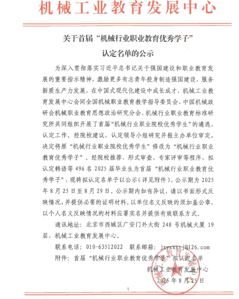 近日,首届“机械行业职业教育优秀学子”遴选认定结果正式公布。