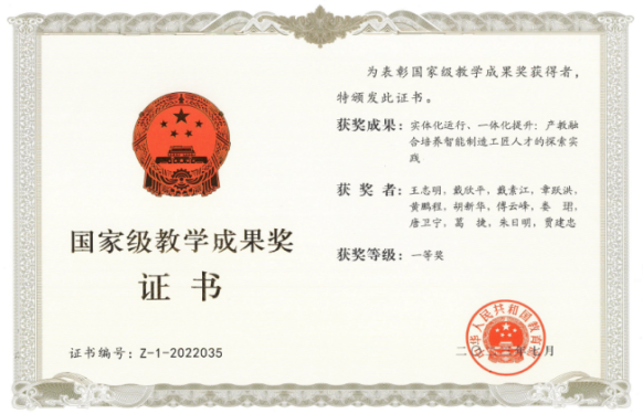 ——国家级教学成果一等奖《实体化运行、一体化提升:产教融合培养智能制造工匠人才的探索实践》,2023