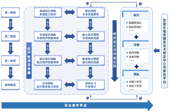 我们引入世界一流企业的先进工程案例和典型生产实践项目,用项目导师制、项目化教学、园区课程等形式把不同类型的项目融入大家的学习过程,形成“项目串接、学研互动”的课程体系;通过大家在项目实施过程中的摸爬滚打,了解、熟知、掌握从概念设计到产品制造的全过程技能。
